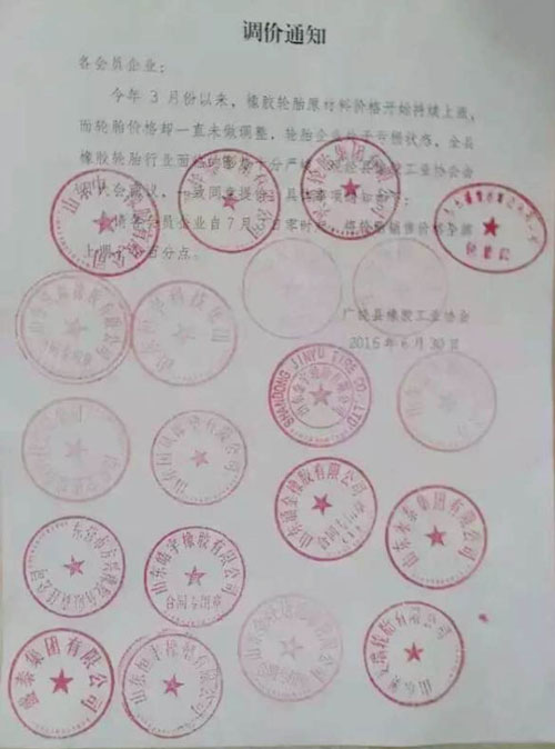 调价通知称,今年3月份以来,橡胶轮胎原材料价格开始持续上涨,而轮胎价格却一直未做调整,轮胎企业处于亏损状态,广饶全县轮胎企业面临十分严峻的形势,经该县橡胶工业协会会议商议,一致同意提价。