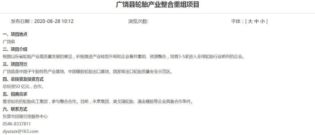 2020年8月28日,东营市投资促进局发布“广饶县轮胎产业整合重组项目”招商公告。该公告表示,项目总投资达50亿元,需求知名的轮胎化工集团,参与整合合作。东营政府还积极牵头“银企合作”,为广饶轮胎的整合注入强大的资本。有力改善了广饶轮胎企业之间互联互保的困境,使真正有实力的企业避免因资金链断裂而面临经营困境。