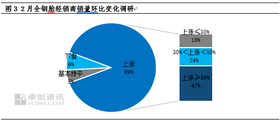 当前,交通运输、重卡销量等与全钢胎配套、替换销量息息相关的行业也在有序向好发展,有效提振了全钢胎市场信心。从国内62家全钢胎经销商的销量情况来看,2月份国内轮胎销量上涨是主基调,接近九成商家销量环比上涨。
