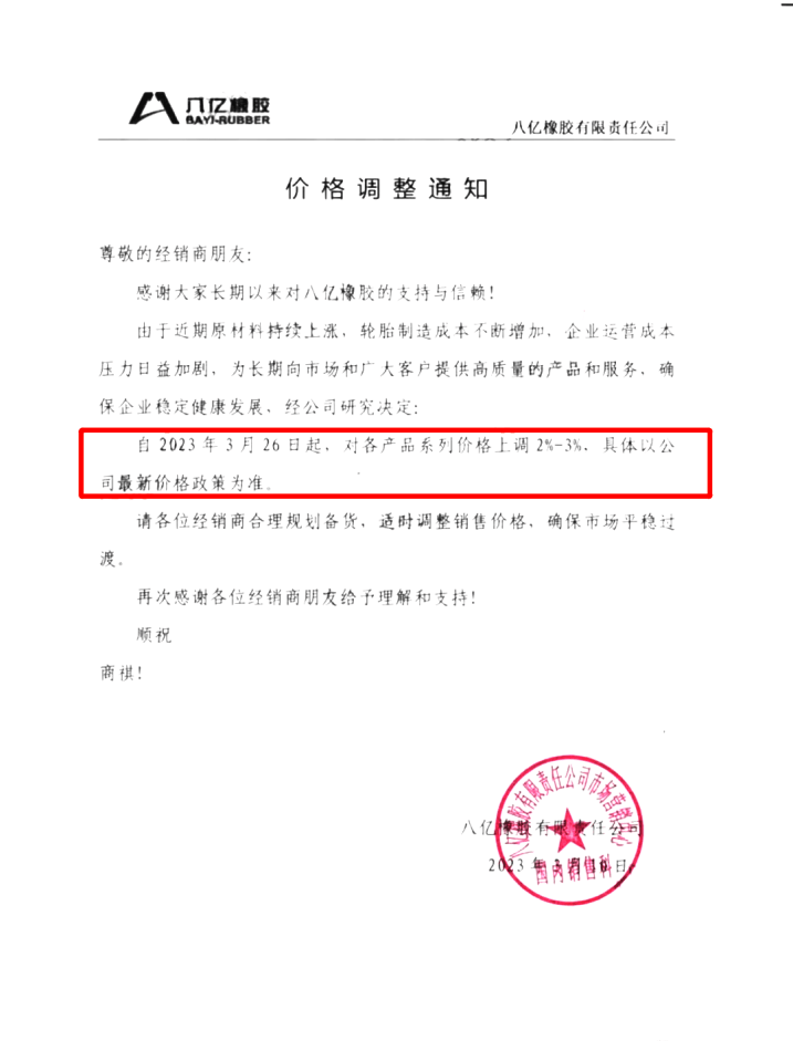 八亿橡胶发布涨价通知,自2023年3月26日起,对各产品系列上调2%-3%,具体以公司最新价格政策为准。