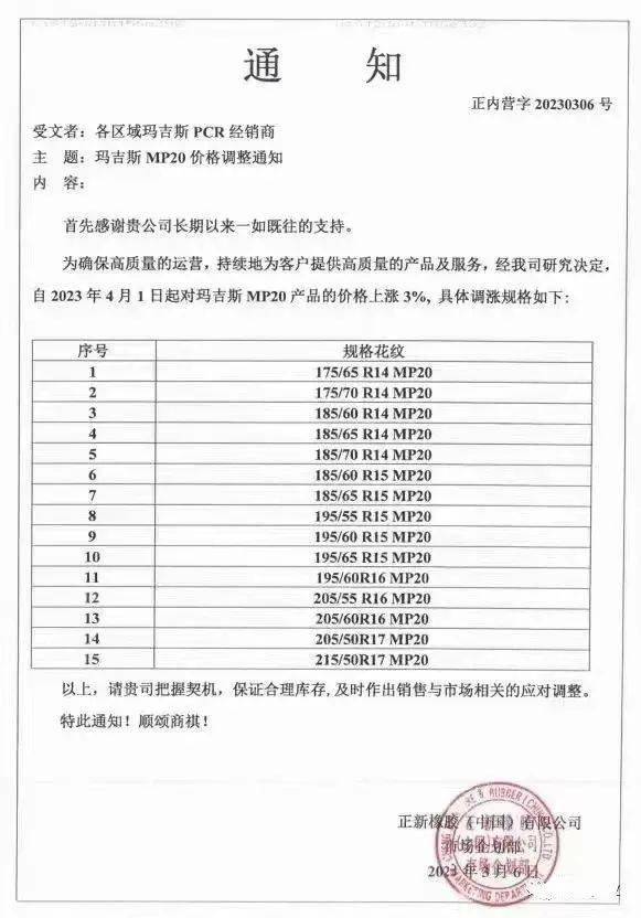 正新橡胶发布通知,自2023年4月1日起对玛吉斯MP20产品价格上涨3%。