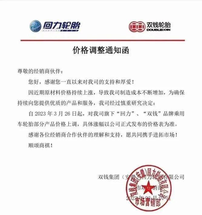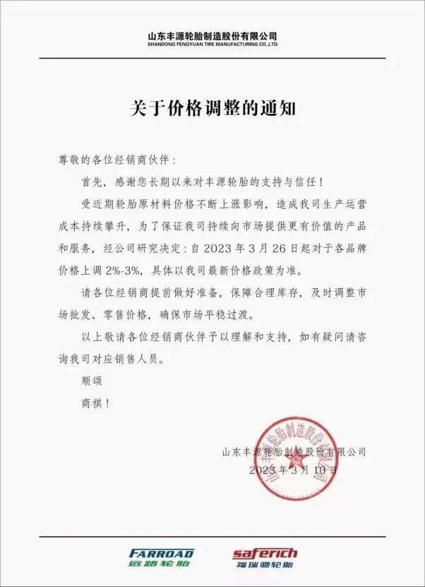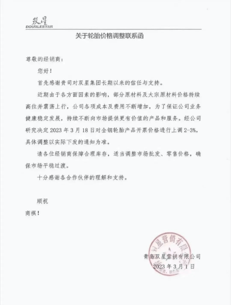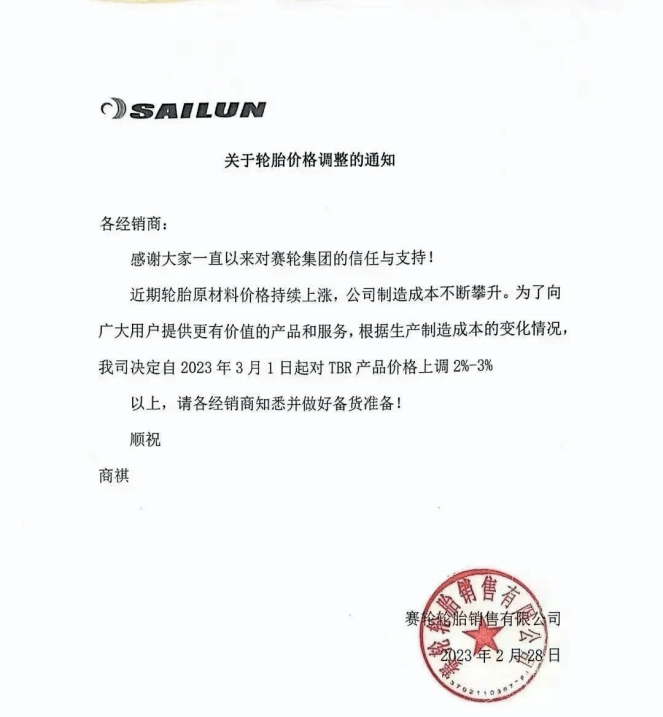 赛轮集团决定自2023年3月1日起对TBR产品价格上调 2%-3%以上,并提醒各经销商知悉并做好备货准备。