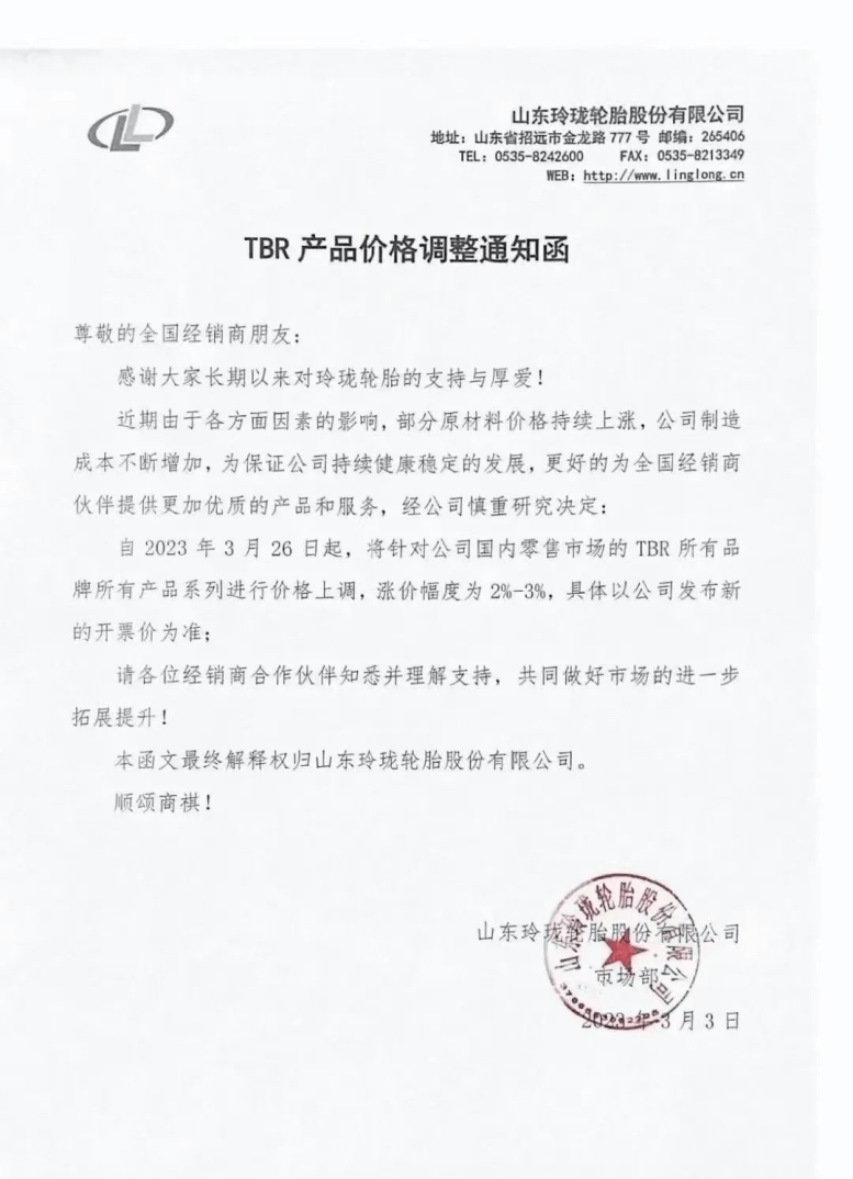 玲珑轮胎自2023年3月26日起,将针对公司国内零售市场的TBR 所有品牌所有产品系列进行价格上调,涨价幅度为2%-3%,具体以公司发布新的开票价为准。