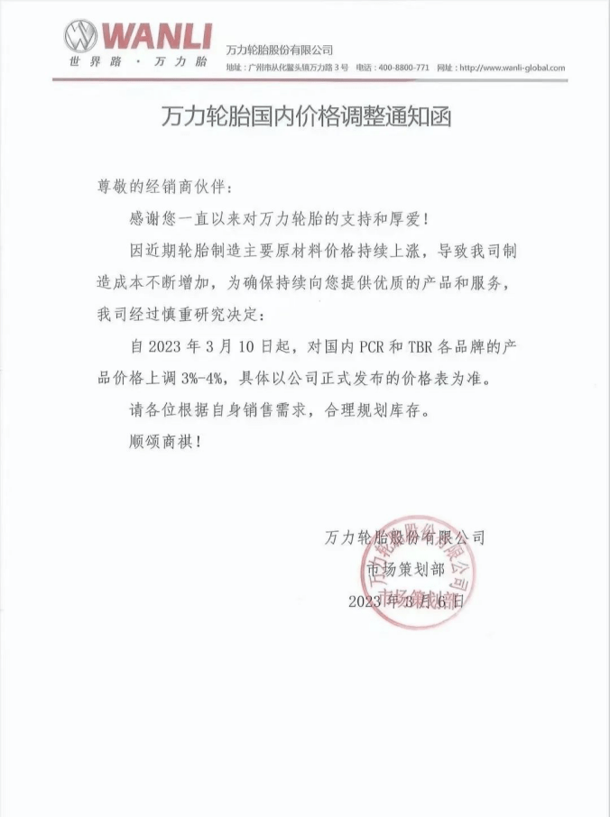 万力轮胎自2023年3月10日起,对国内PCR和TBR各品牌的产品价格上调 3%-4%,具体以公司正式发布的价格表为准。