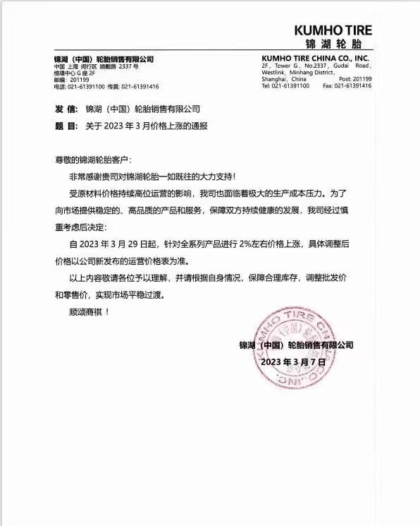 锦湖轮胎自2023年3月29日起,针对全系列产品进行 2%左右价格上涨,具体调整后价格以公司新发布的运营价格表为准。