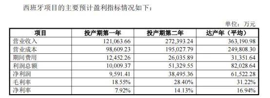 在西班牙工厂逐步投产及达产后,随着生产环节的规模化效应持续释放,毛利率将逐步提升,预计投产期第1年为18.55%,第2年为 28.40%,达产年后为31.22%。
