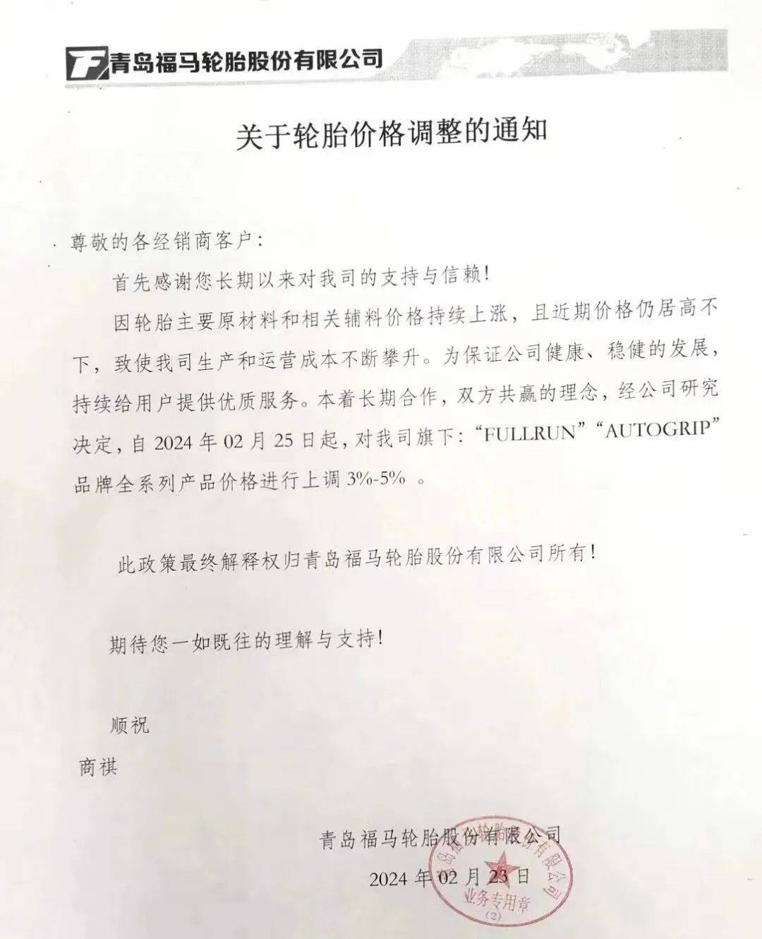 2月23日,青岛福马轮胎股份有限公司宣布,自2月25日起,将该公司旗下的“FULLRUN”“AUTOGRIP”品牌全系列产品价格上调3%~5%。