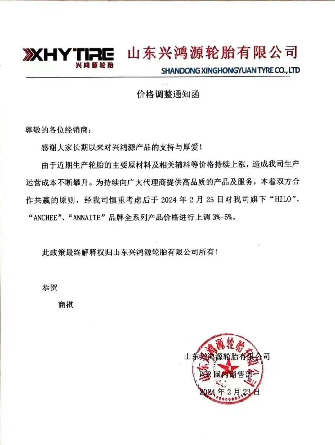 2月23日,山东兴鸿源轮胎有限公司宣布,自2月25日起,将其旗下多个品牌的全系列产品价格上调3%~5%。
