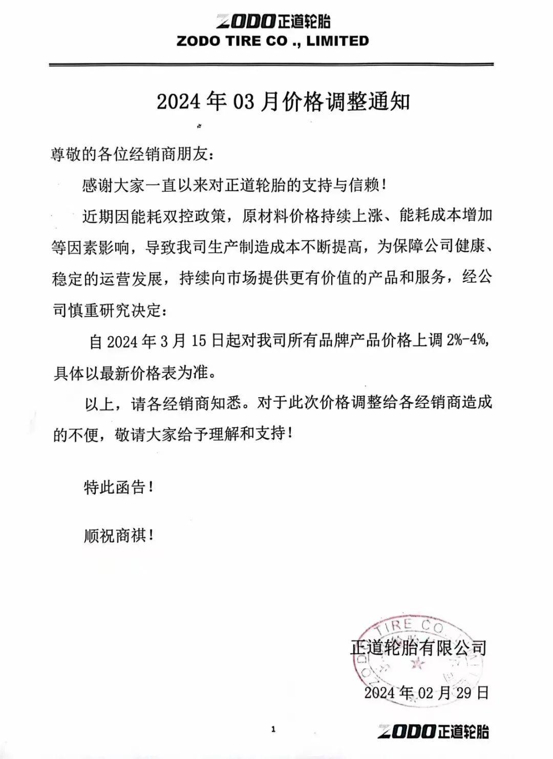 2月29日,正道轮胎有限公司发布价格调整通知。