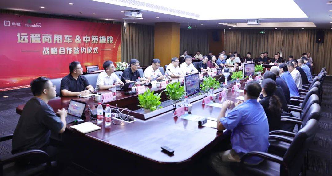 中策橡胶党委书记、董事长、总经理沈金荣,中策橡胶集团高级副总经理葛国荣与远程商用车董事长、CEO范现军,汉马科技副总经理钱鑫等,出席签约仪式。