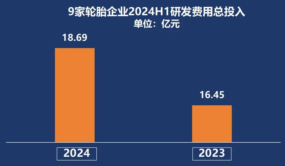 此外,2024年1-6月,9家轮胎企业的研发费用达到18.69亿元,和去年同期的16.45亿元相比大大提升。