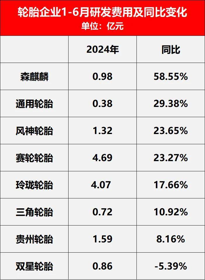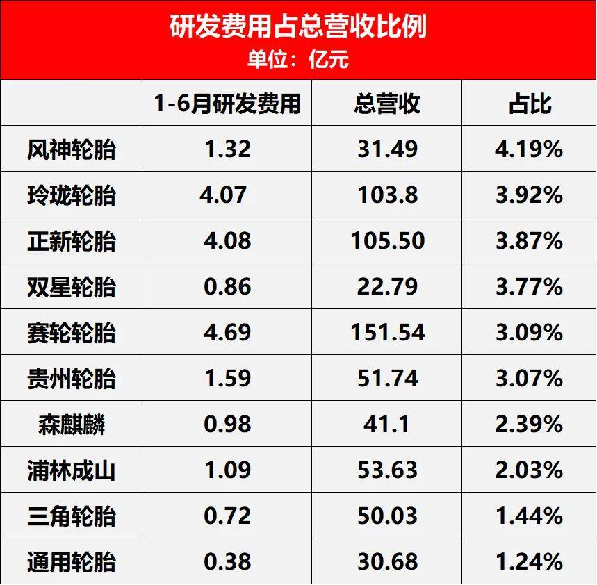 在2024年上半年的研发数据中,风神轮胎以其高额的研发费用占比脱颖而出,成为最注重研发的企业之一。