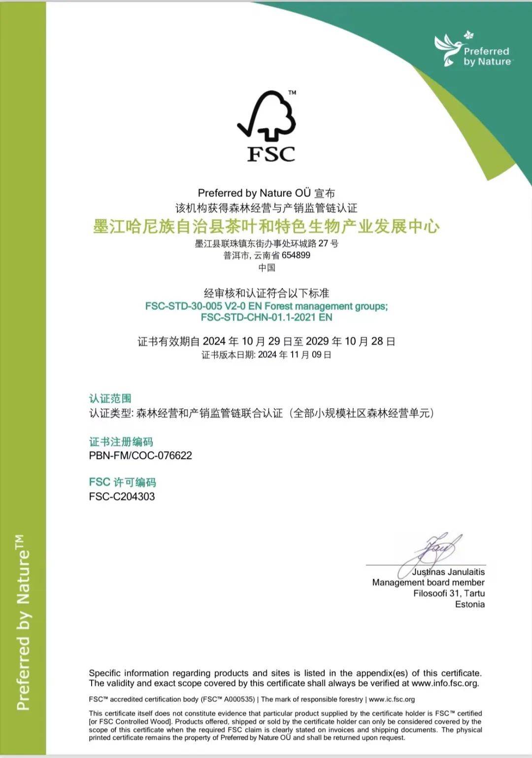 据了解,云胶墨江公司在当地并没有自有种植园,所收生胶均来自当地小农户,经过分析,当地适合采用“小农户联合认证方式”开展森林认证,但涉及小农户且居住地较为分散,交通不便利,部分小农户文化水平参差不齐,给日常宣传和培训工作带来很大难度,仅依靠企业无法快速有效推动工作的开展。结合当地实际情况,墨江县橡胶种植面积广阔,是当地农户的重要经济来源,通过FSC认证,墨江县的橡胶产品将有机会进入国际高端市场,拓宽销售渠道,提高议价能力。认证活动得到了当地县政府、乡镇、村委会各级政府部门的积极响应。墨江县人民政府成立认证工作领导小组,通过不懈努力, 2024年10月下旬,云胶墨江公司获得FSC COC(产销监管链认证)认证证书,墨江县茶特中心获得FSC FM(森林经营)认证证书。此次认证总面积16.48万亩,其中橡胶林面积14.73万亩,天然林1.75万亩,涉及7436户胶农,为当地群众增收致富和云胶墨江公司生产经营活动创造了有利条件。