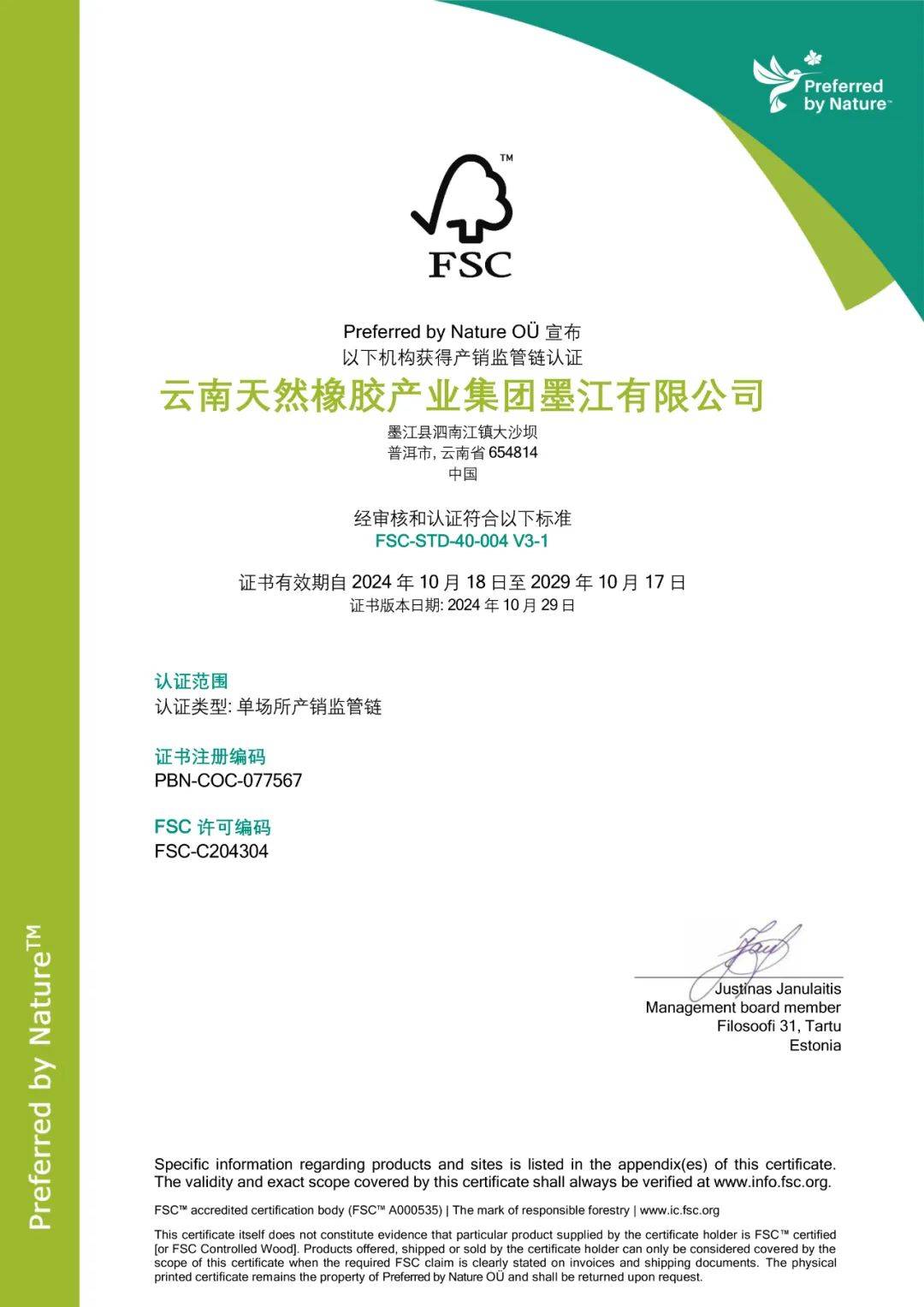 森林管理委员会(FSC)诞生于1994年,致力于企业在生产过程中严格遵守环保、社会和经济三大原则。墨江橡胶林通过FSC认证,意味着其天然橡胶产品的生产全过程符合国际公认的环保和社会责任标准,为消费者提供了更加绿色、可靠的选择,也增强了企业的国际市场竞争力。