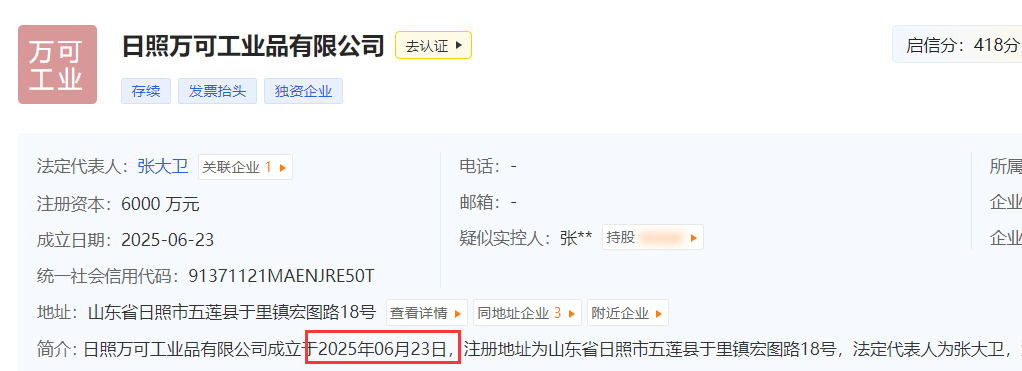 资料显示,投资方日照万可公司,是一家成立不到2个月的新公司。