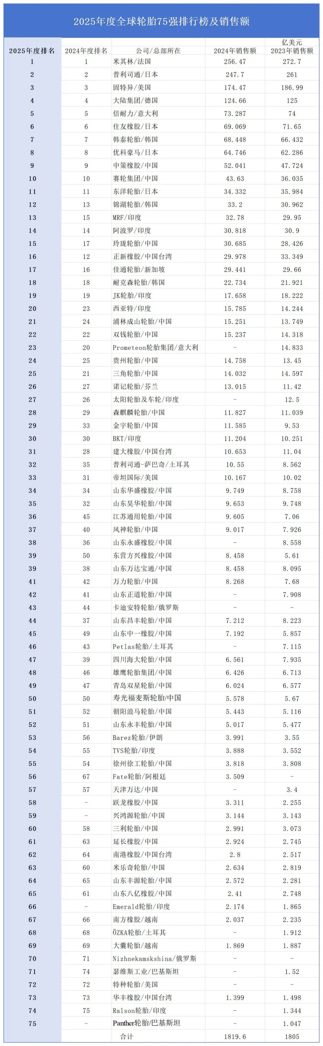 2025年度全球轮胎75强排行榜8月25日对外公布。