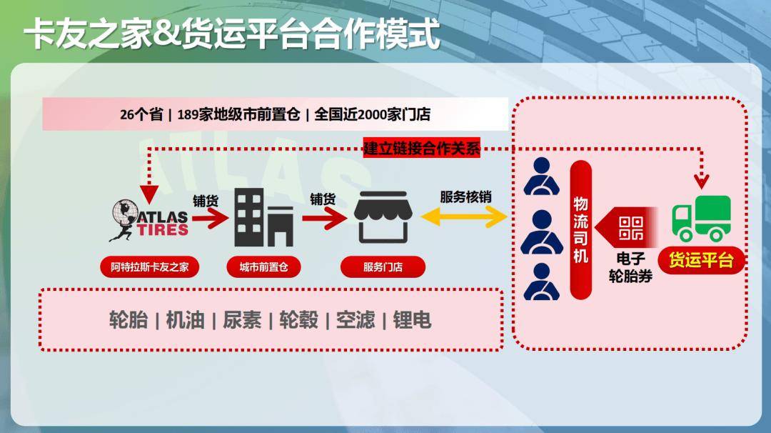 阿特拉斯卡友之家合作门店已覆盖全国26个省及直辖市、189个地级市,平台汇聚50万名卡友及车队用户。通过app轮胎管理系统实现车主的轮胎安装服务等记录,运用网络化的服务体系,可在不同时间,不同地点为车队提供轮胎十三项安全检查,轮胎维护保养,追踪每一条轮胎的使用情况,实现轮胎全生命周期管理,为车队降本增效!
