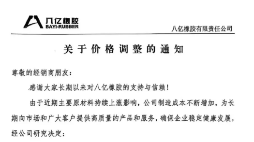 自10月18日起,八亿橡胶对各产品系列价格上调,涨价幅度2%。