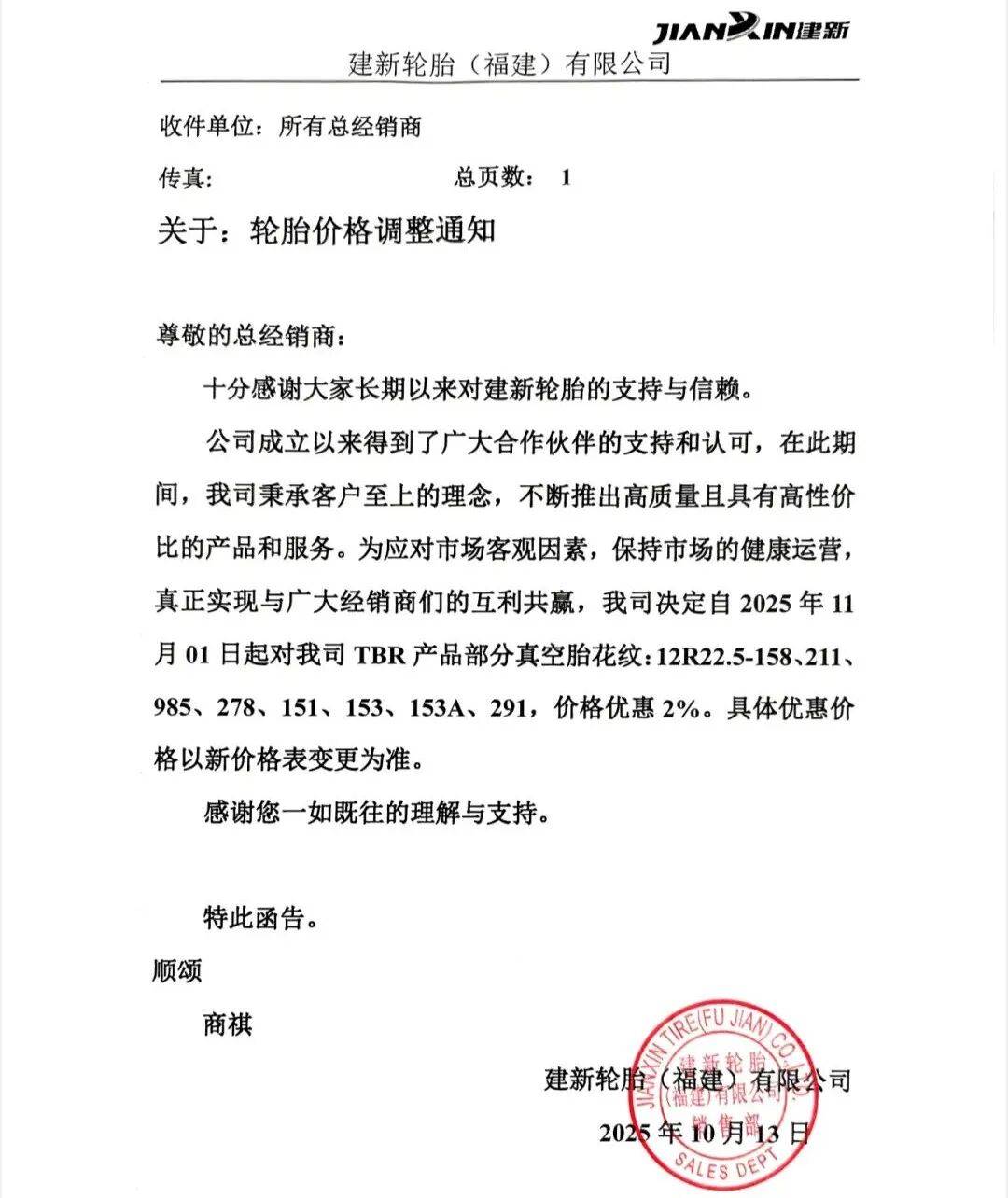 建新轮胎表示,此次降价,旨在应对市场客观因素,保持市场健康运营。