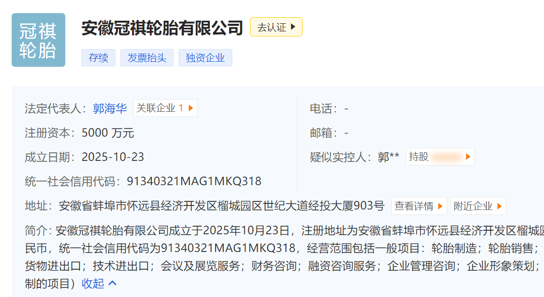 2025年10月23日,安徽冠祺轮胎有限公司,正式成立。