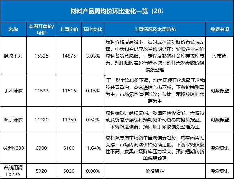 合成橡胶方面,当前在国内供应增量与进口充裕双重影响下,丁二烯市场供应面仍将对行情施压;短期轮胎及制品企业多根据自身订单情况运行生产,对原料刚需采购,且压价迹象明显,而轮胎企业面临欧盟反倾销导致的订单减少,半钢胎开工情况或不稳,偏空因素依然占据主导,整体预计合成橡胶价格维持区间弱势震荡表现。