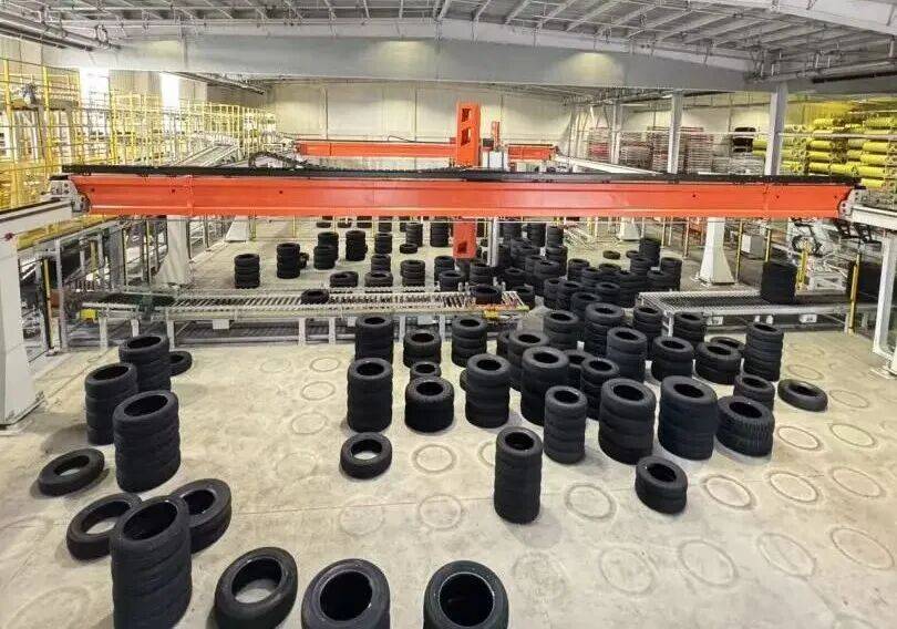 该项目构建的全自动化轮胎分拣装笼体系,日处理能力达3万条。