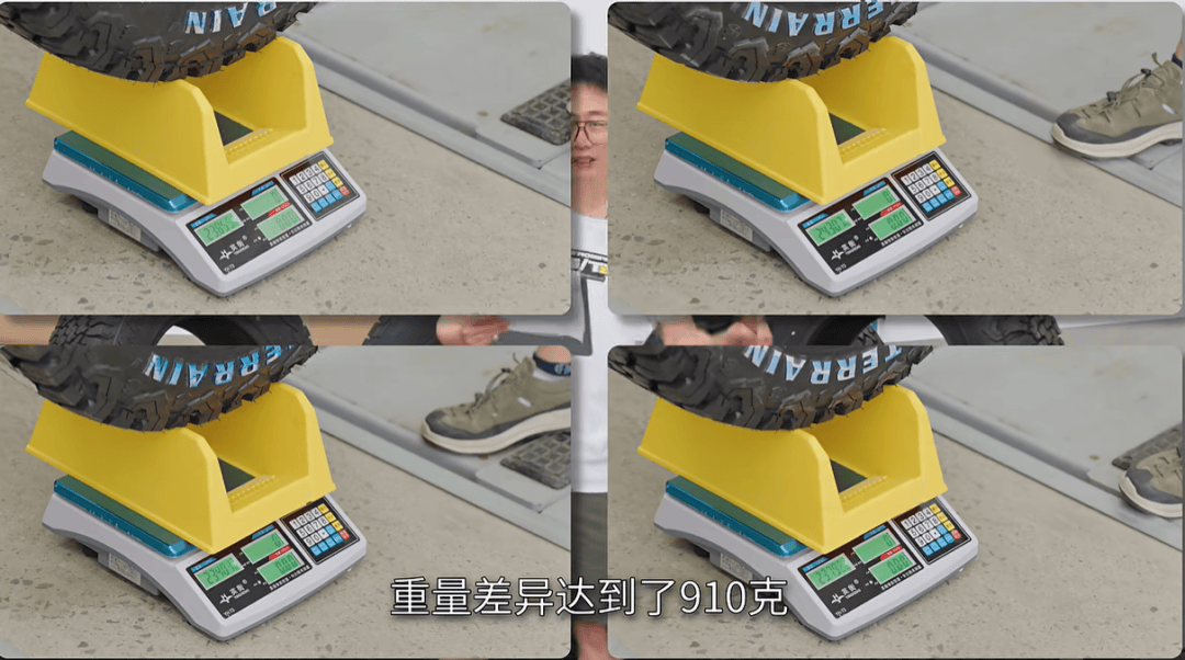 其中发现,4条黑熊AT轮胎中,有1条重量超出其他3条约1公斤。