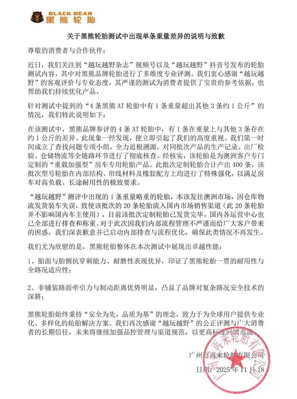 黑熊表示,近日某账号发布了轮胎测试内容,针对测试中提到的“4条黑熊AT轮胎中有1条重量超出其他3条约1公斤”的情况。