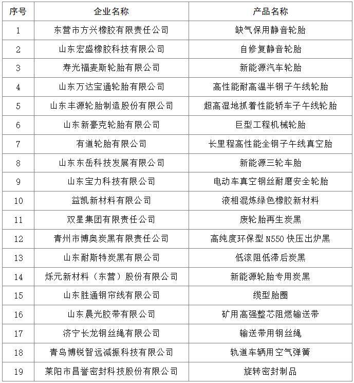 作为橡胶工业大省,山东省此次入围名单的产品涉及广泛,包括轮胎(力车胎)、橡胶及炭黑和胎圈钢丝等原辅材料、输送带、橡胶制品等。