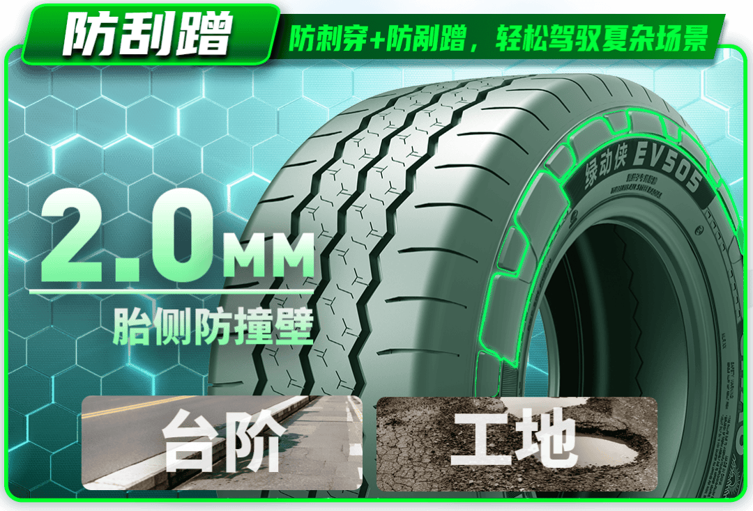 独特的冠部抗刺穿和胎侧防剐蹭设计,大大降低轮胎的故障率。